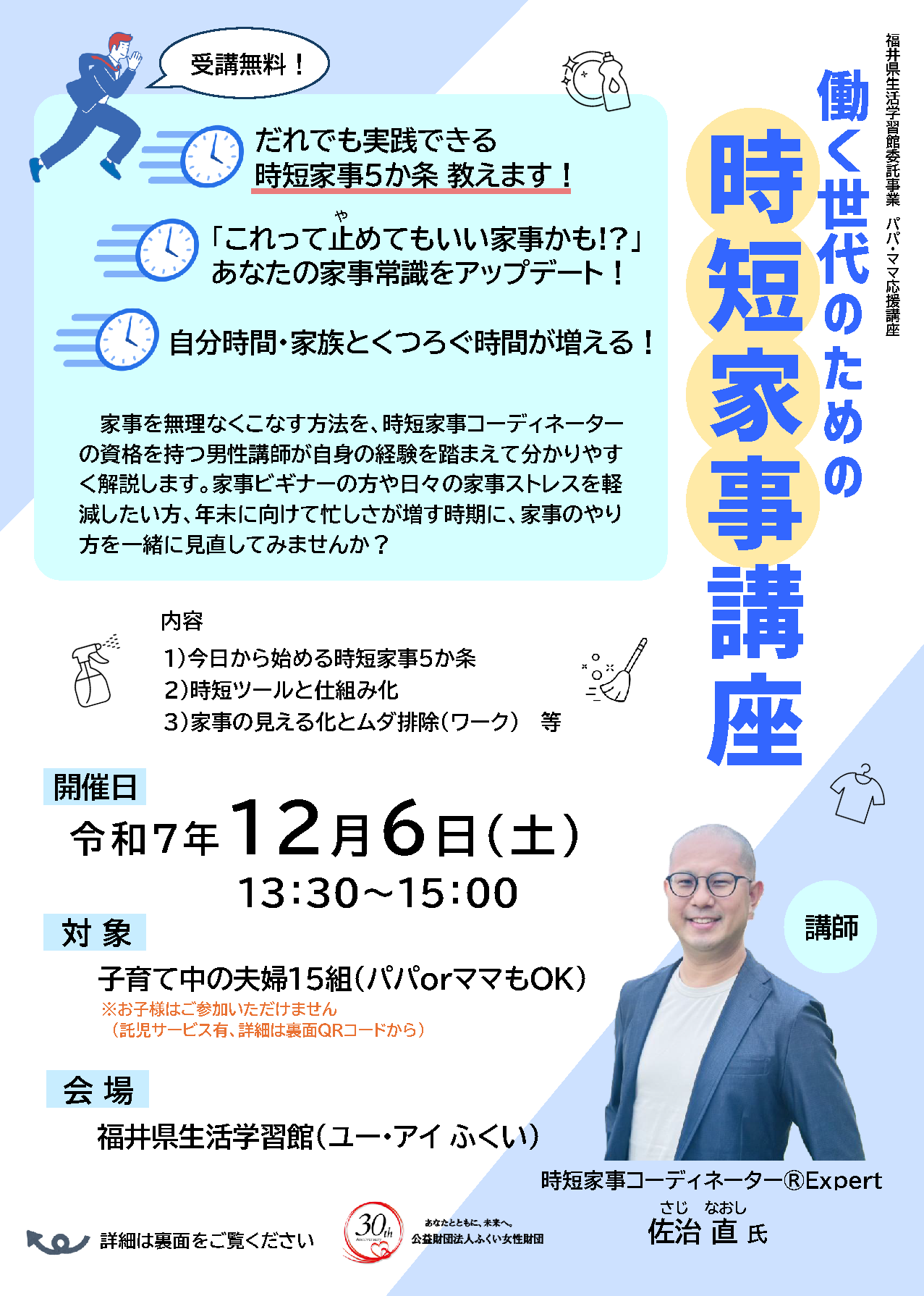 家事を無理なくこなす方法を、時短家事コーディネーターの資格を持つ男性講師が自身の経験を踏まえて分かりやすく解説します。家事ビギナーの方や日々の家事ストレスを軽減したい方、年末に向けて忙しさが増す時期に、家事のやり方を一緒に見直してみませんか?