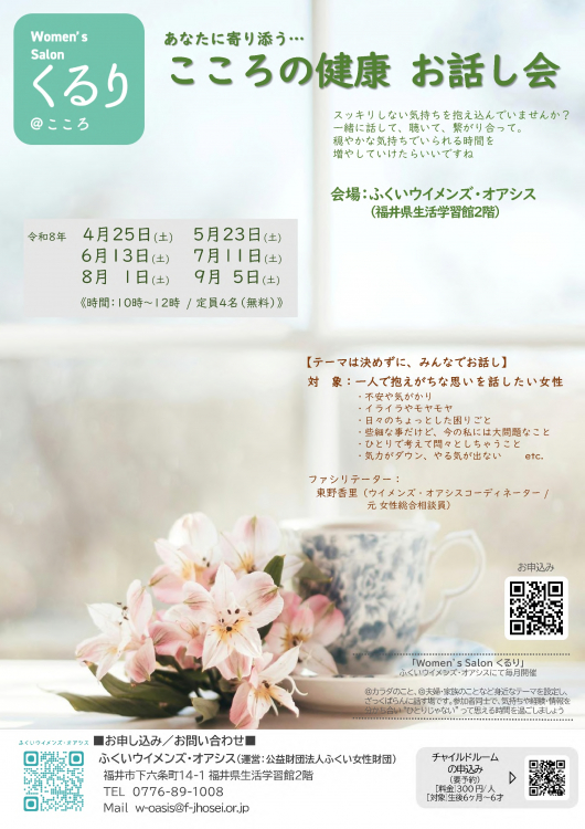 「Women’s Salonくるり」は、「@こころ」「@わたしのカラダ」「@夫婦・家族」「@お仕事」「@おひとりさま」「@ふくい移住者」などの身近なテーマを設定し、ざっくばらんに話し合う場です。