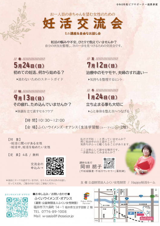 令和8年5月24日(日)「初めての妊活、何から始める?」▶迷わないためのスタートガイド 令和8年7月12日(日)「治療中のモヤモヤ、夫婦のすれ違い…」▶気持ちを整理するヒント 令和8年9月13日(日)「その疲れ、ため込んでいませんか?」▶体調を立て直すセルフケア 令和9年1月24日(日) 「立ち止まる事も大切に」▶心と身体を整え次へつなげる 時間:10:30~12:00