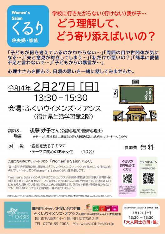 学校に行きたがらない(行けない)我が子… どう理解して、 どう寄り添えばいいの?~Women’s Salonくるり@夫婦・家族