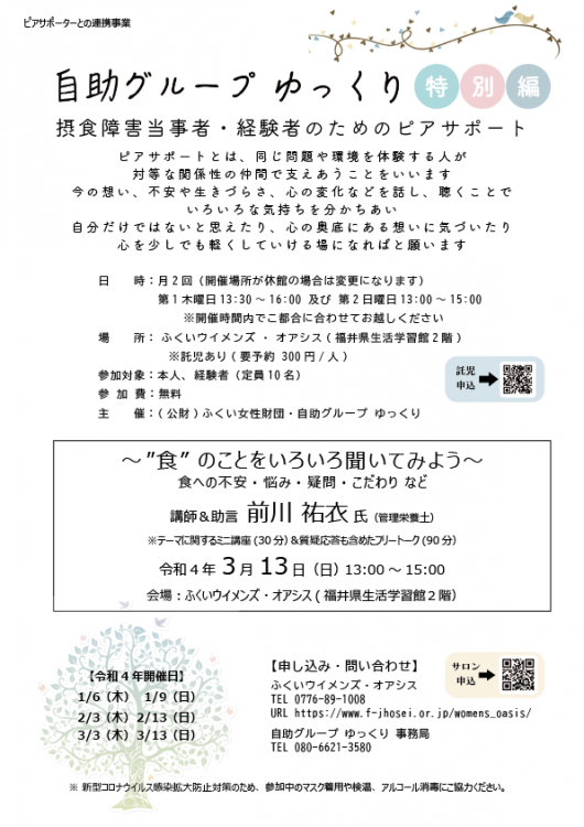 ふくいウイメンズ・オアシスもしくは自助グループゆっくり事務局へお名前、連絡先をお知らせください。 【ふくいウイメンズ・オアシス】 電話 0776-89-1008 またはメール 【自助グループ ゆっくり 事務局】 電話 080-6221-3580 ※定員を超えていない場合は、当日参加もOKです。 |