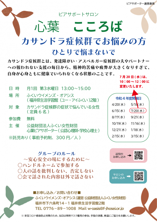 ピアサポートサロン心葉(こころば) ~カサンドラ症候群でお悩みの方、ひとりで悩まないで~