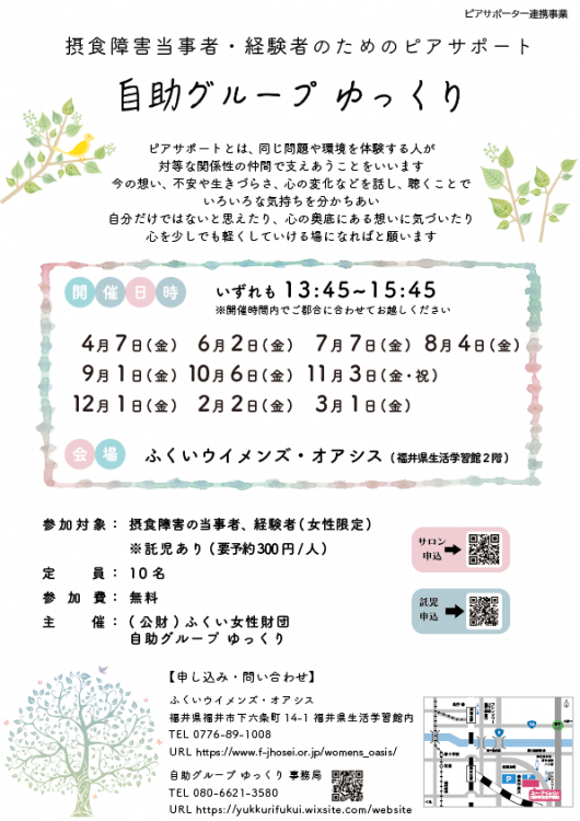 ふくいウイメンズ・オアシスもしくは自助グループゆっくり事務局へお名前、連絡先および参加希望日をお知らせください。