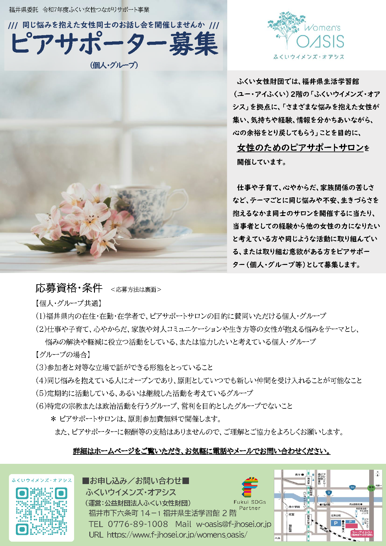 【個人・グループ共通】 (1)福井県内の在住・在勤・在学者で、ピアサポートサロンの目的に賛同いただける個人・グループ (2)仕事や子育て、心やからだ、家族や対人コミュニケーションや生き方等の女性が抱える悩みをテーマとし、悩みの解決や軽減に役立つ活動をしている、または協力したいと考えている個人・グループ 【グループの場合】 (3)参加者と対等な立場で話ができる形態をとっていること (4)同じ悩みを抱えている人にオープンであり、原則としていつでも新しい仲間を受け入れることが可能なこと (5)定期的に活動している、あるいは継続した活動を考えているグループ (6)特定の宗教または政治活動を行うグループ、営利を目的としたグループでないこと ※ピアサポートサロンは、原則参加費無料で開催します。また、ピアサポーターに報酬等の支給はありませんので、ご理解とご協力をよろしくお願いします。 |