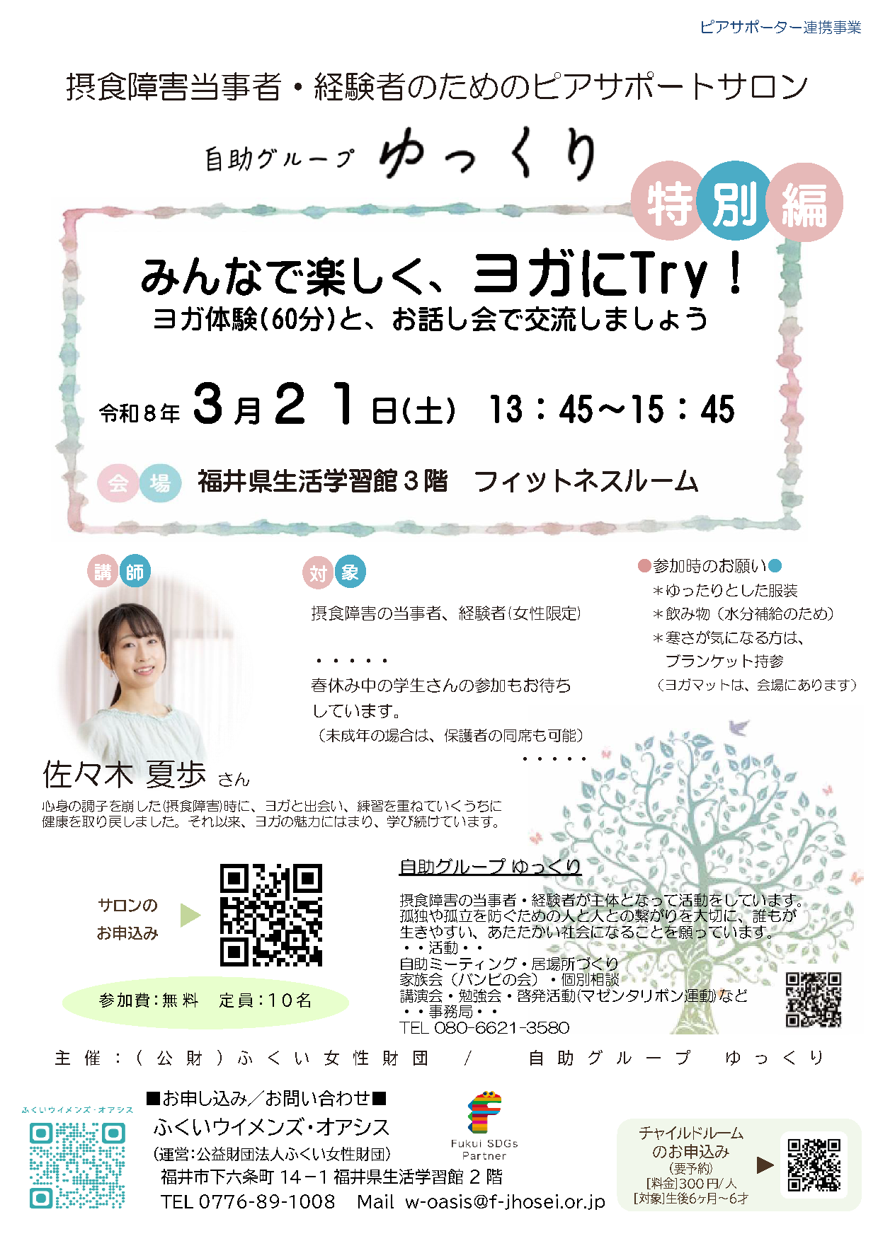 ふくいウイメンズ・オアシスもしくは自助グループゆっくり事務局へお名前、連絡先および参加希望日をお知らせください。