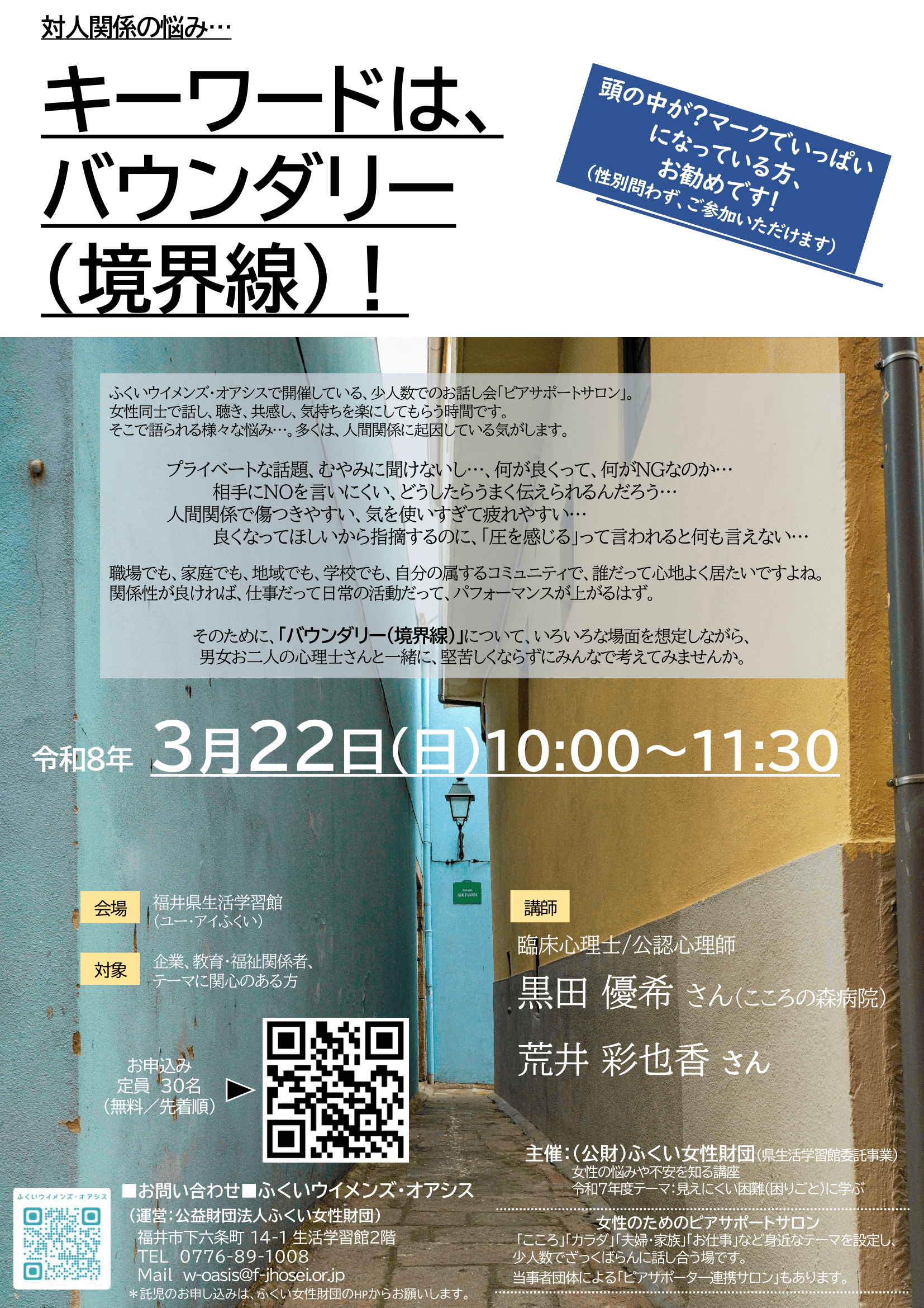 ふくいウイメンズ・オアシスで開催している、少人数でのお話し会「ピアサポートサロン」。